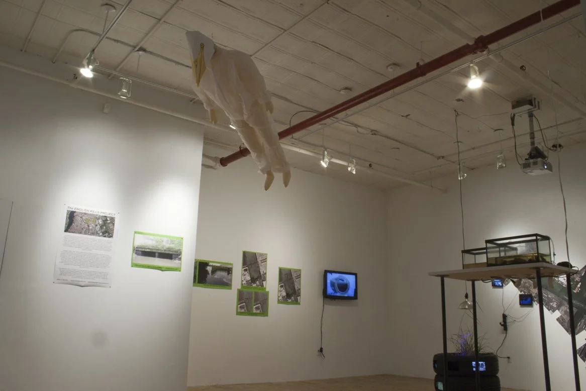 Though primarily known as a socially engaged practice, the ENGLISH KILLS PROJECT also could be realized in installation and sculptural form. Installation could take the form of wall maps, video, tire gabions, and works made from the soil and marine life of English Kills. Among the numerous venues have been Momenta Gallery (Brooklyn, NY), McKinney Avenue Contemporary (Dallas, TX), SVA Gallery (Manhattan, NY), Invisible Dog (Brooklyn, NY), and my local laundromat, exhibited as a 2 channel video on flat screen for laundry customers to watch. (channel 1), (channel 2).